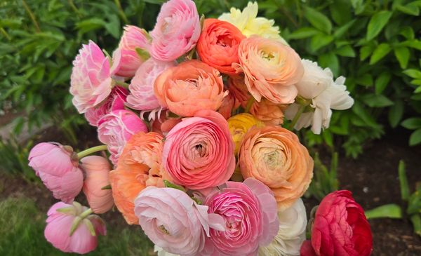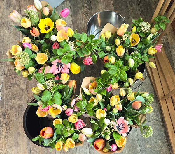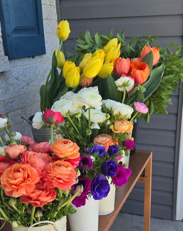 Pre-order a lovely arrangement of the garden's best! Next day pickup at our flower shed,where it will be labeled and packaged for you. Photo is example only.